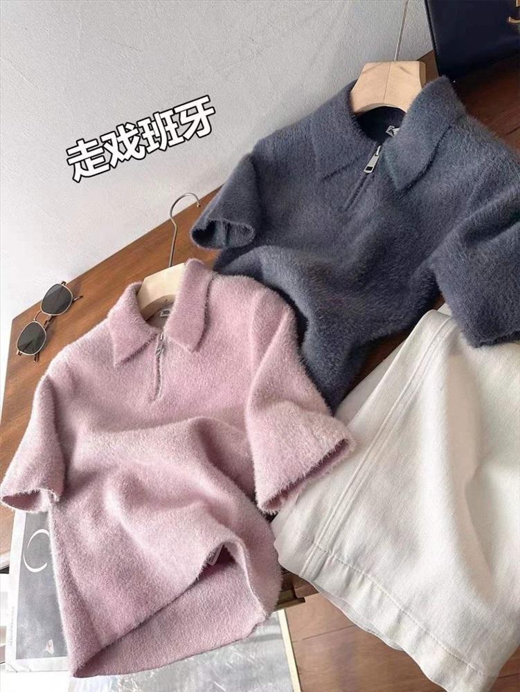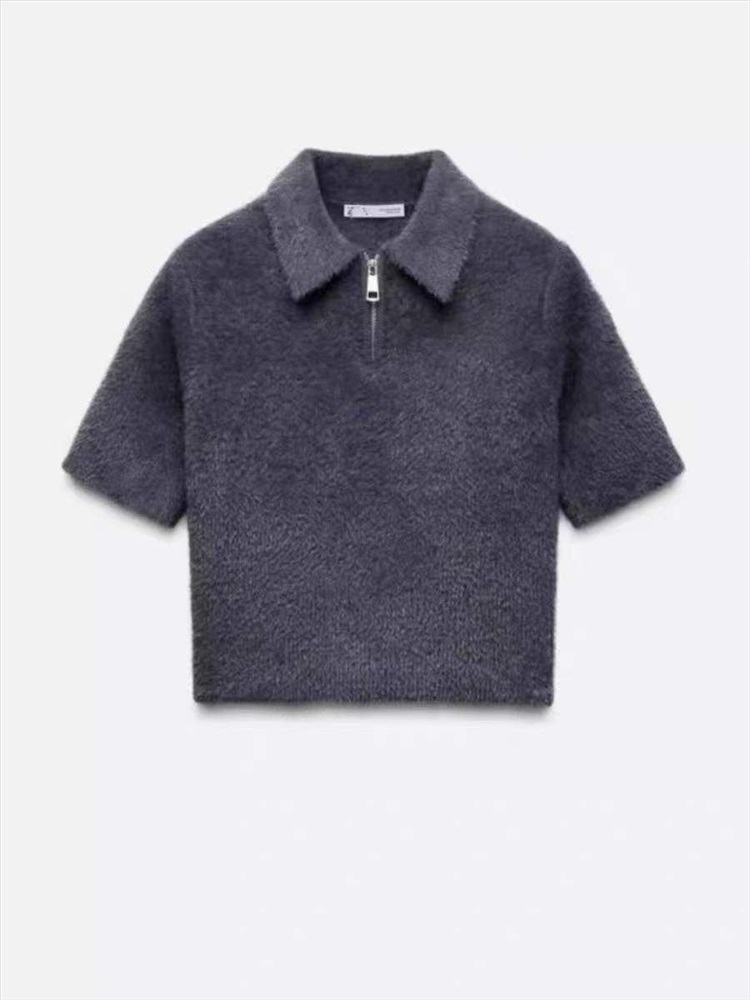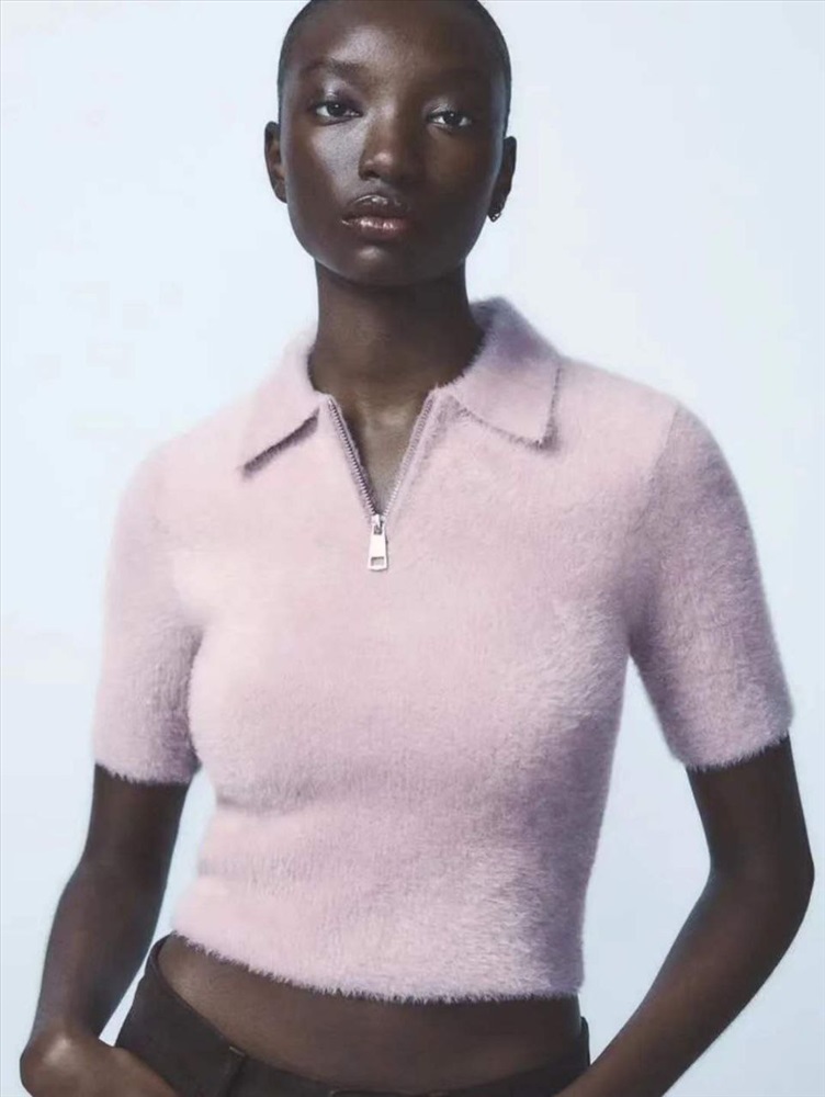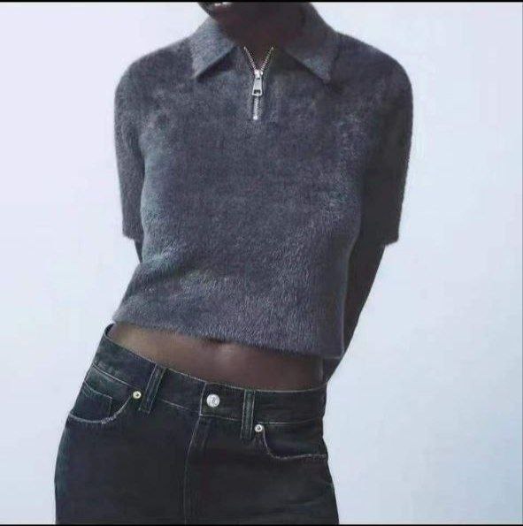 Женский мягкий укороченный пуловер из пушистой пряжи с короткими рукавами и молнией ЗАР*А