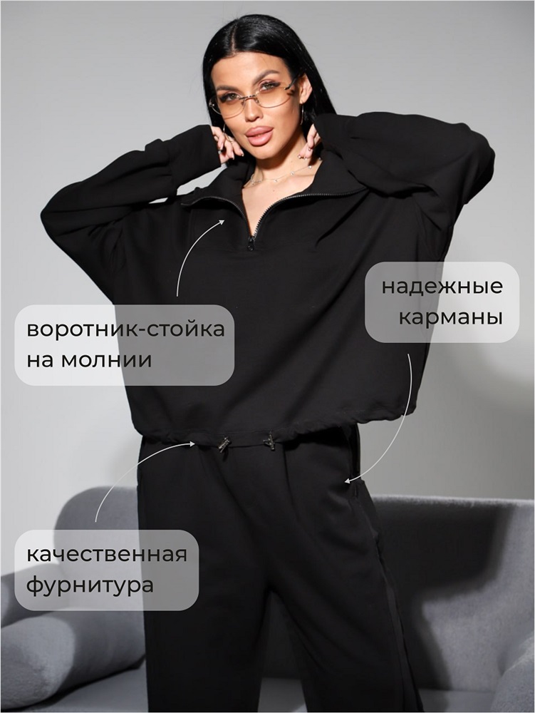 Состав: 75%хлопок 5%лайкра 20% полиэстер Модель: Женский трикотажный костюм с широкими брюками и кофтой 405 Тип товара: костюм с брюками Материал: футер 2-х нитка | футер 2-х нитка Бренд: NINEL Карман: боковые | прорезные НДС: Без НДС Особенности: на резинке Отделка: с эмблемой | с карманами | с манжетами | со шнурком Посадка: высокая посадка Рисунок: однотонные Рукав: длинный рукав Сезонность: лето | осень | весна | зима Силуэт: оверсайз | свободный Стиль: молодежный | повседневный | спортивный Воротник: воротник стойка Застежка: молния Женский костюм NINEL с брюками и кофтой это готовый стильный образ для тех, кто ценит комфорт, актуальный дизайн и безупречную посадку. Костюм легко вписывается в повседневный гардероб, подходит для прогулок, поездок, работы в свободном дресс-коде и позволяет выглядеть современно без лишних усилий. Преимущества - Премиальный трикотаж даблфейс мягкий, плотный и приятный к телу - Свободный крой не сковывает движения - Широкие брюки визуально удлиняют ноги и выравнивают силуэт - Укороченная кофта с регулировкой объёма - Универсальный чёрный цвет легко сочетается с обувью и аксессуарами - Современный дизайн Продуманная посадка и уход Костюм разработан с акцентом на комфортную посадку и аккуратный силуэт. Свободный крой и эластичные элементы позволяют изделию мягко адаптироваться к фигуре и сохранять форму в течение дня. Трикотаж даблфейс отличается износостойкостью и не теряет внешний вид Таблица размеров и весаБрюки