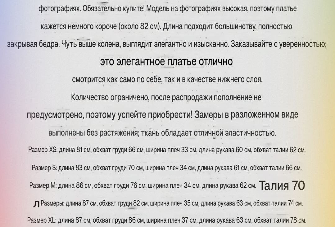 Если вам не подошел размер, не понравилось качества материала и тд. - не является причиной для возврата товараТочные сроки доставки зависят от загруженности таможни!