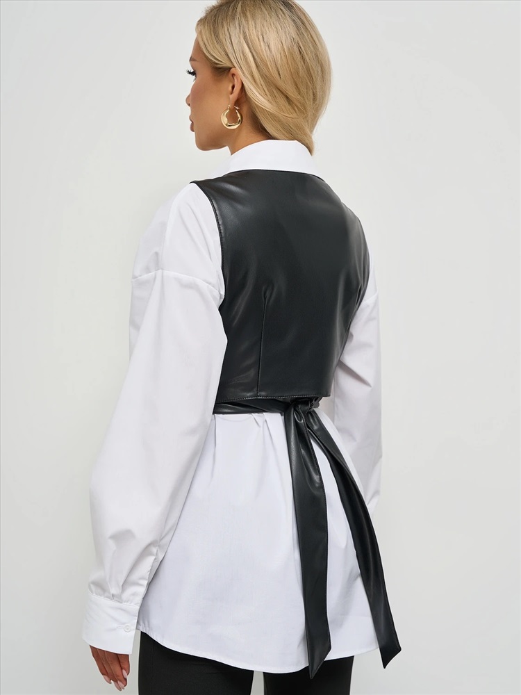 Жилет на запах на завязках из искусственной кожи.