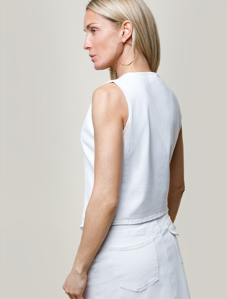 Жилет выполнен из эластичного денима. Крой, приталенный с V-образным вырезом подчеркнут тонкими бежевыми строчками. Изделие хорошо сочетается в total denim образе или низами из лиоцелла, льна и хлопка. Эластичный материал гарантирует комфорт и формоустойчивость.