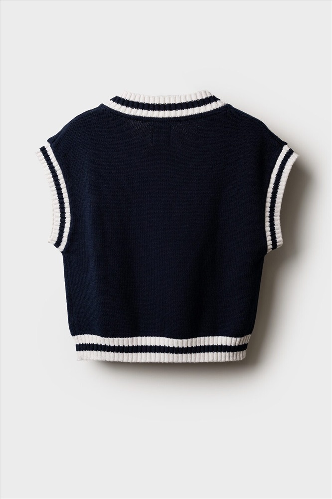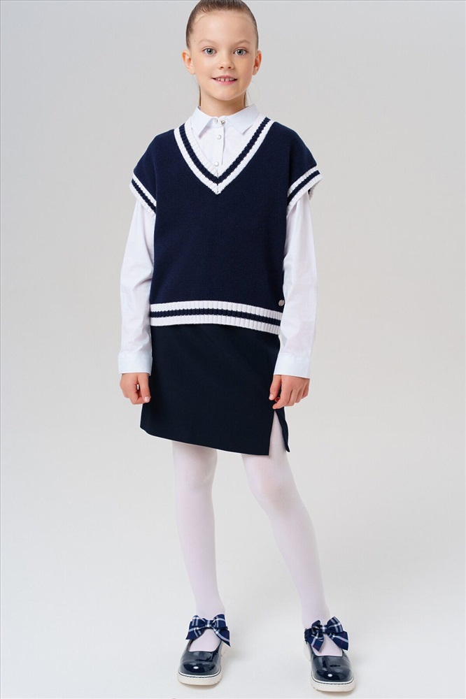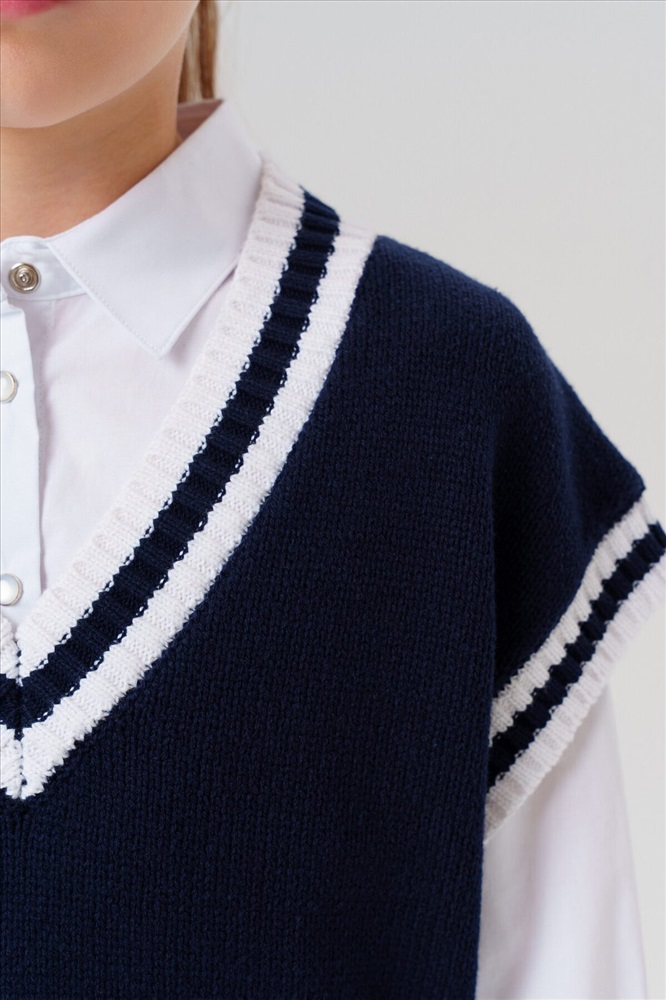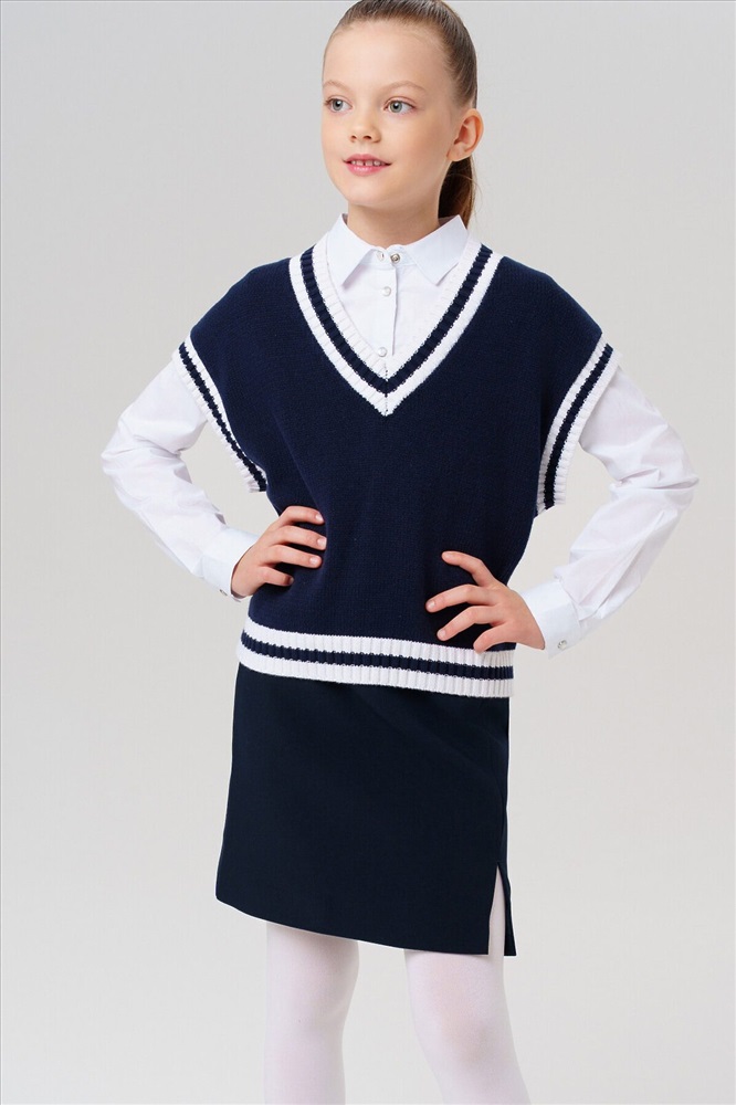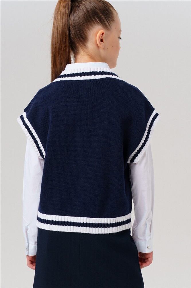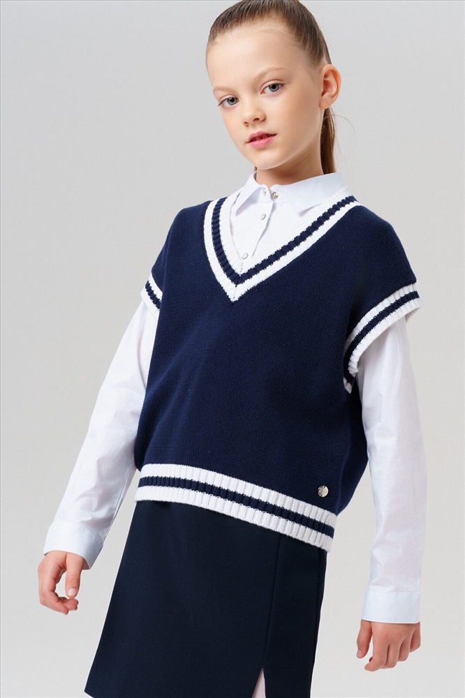 Стильный школьный укороченный темно-синий жилет для девочки подростка. Этот модный жилет для школы станет универсальным элементом гардероба юной модницы. Модель выполнена в comfort силуэте – свободный крой обеспечивает комфорт в движении и современный внешний вид. Почему стоит выбрать: Идеально подходит для школы – сочетает удобство и аккуратный внешний вид Удобный крой не сковывает движения Стильный дизайн понравится подросткам, следящим за модой Отличный вариант для повседневной носки и школьных будней. Качественные материалы и продуманный крой делают этот жилет практичным выбором для девочки школьницы.