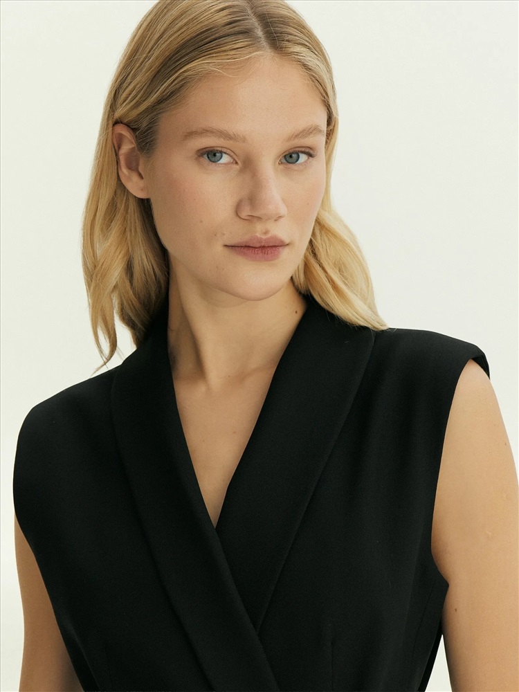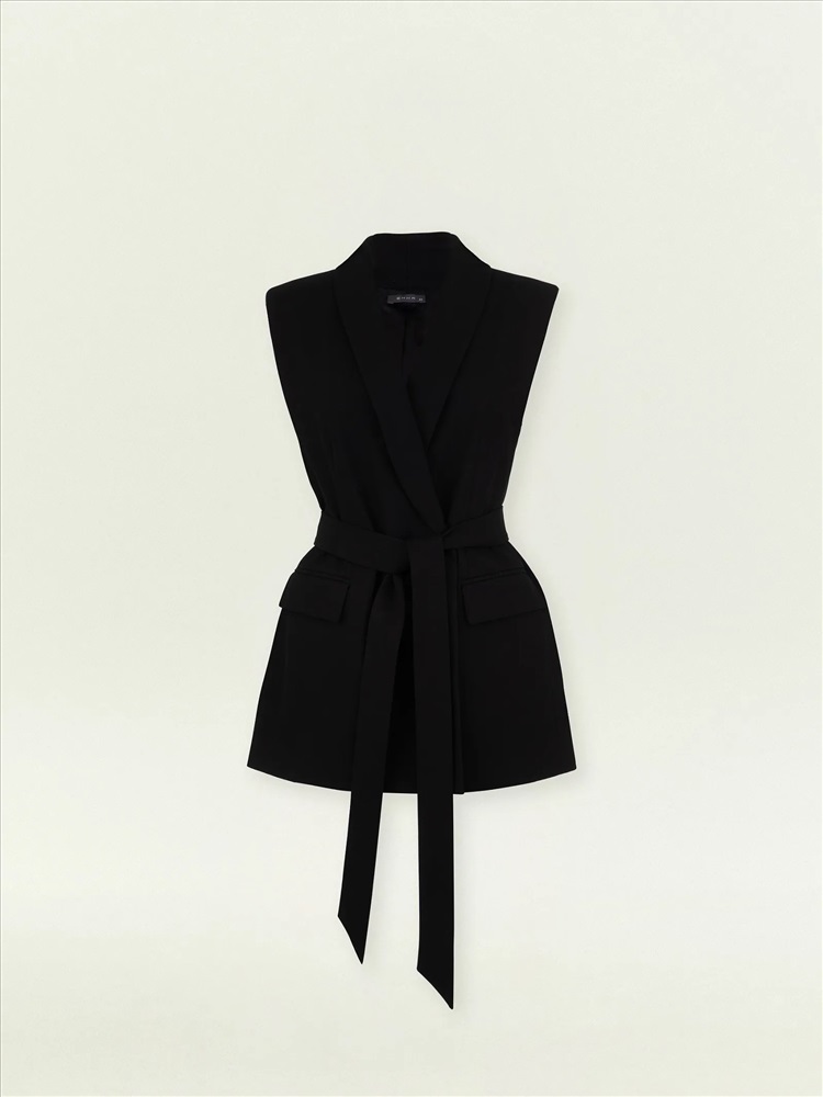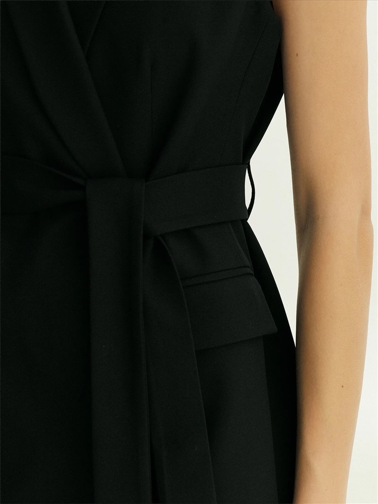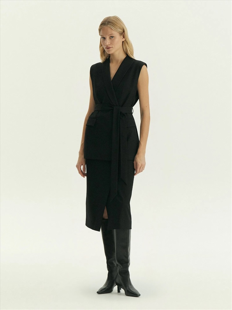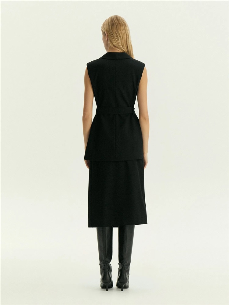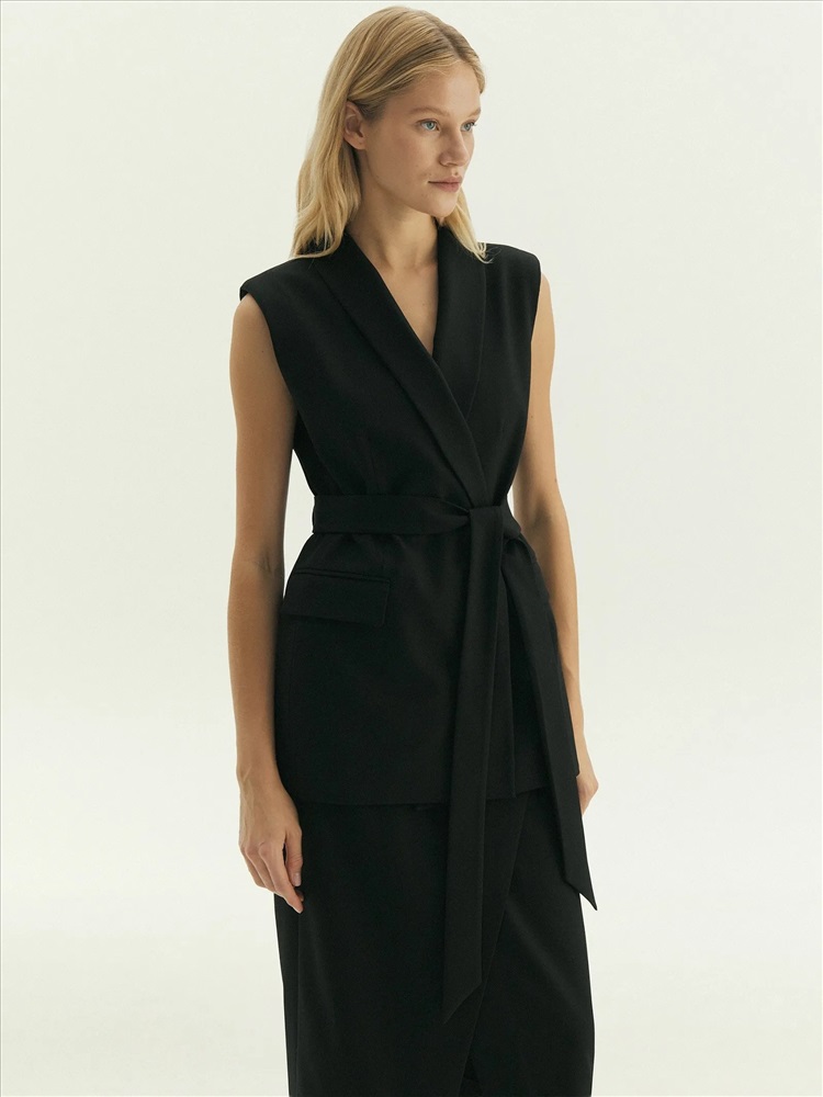 Жилет для деловых и кэжуальных образов на каждый день. Стильная модель имеет шалевый воротник и карманы с клапанами. Застёгивается на две потайные пуговицы и дополнен поясом, который можно завязать разными способами по вкусу. Жилет сделан из приятной костюмной ткани, на подкладке с вискозой. Может стать частью большой капсулы с жакетами, брюками и юбками monk.