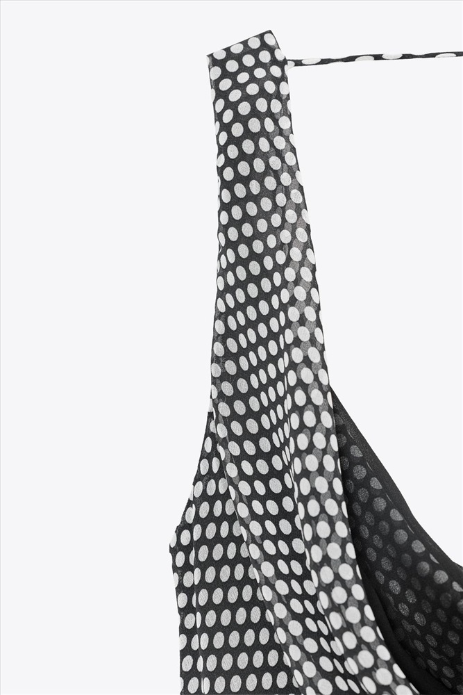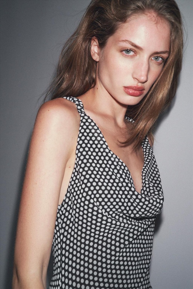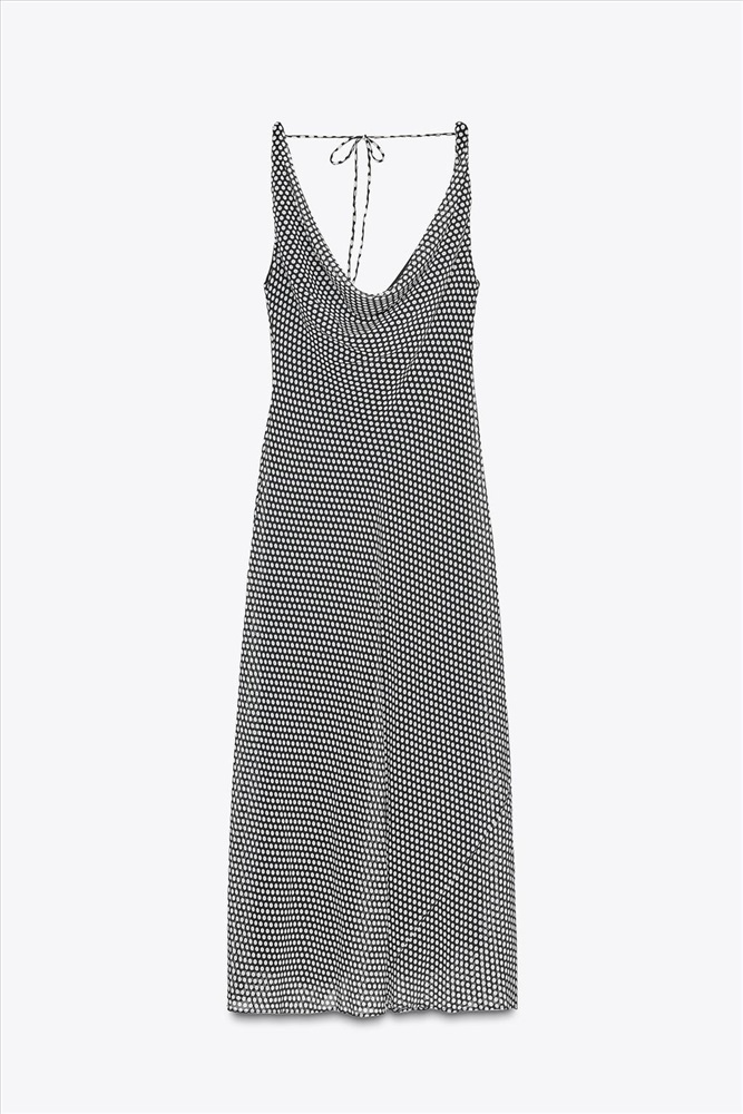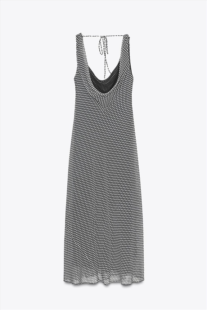 Midi dress with a flowing neckline and sleeveless design. Open back with adjustable tie detail. Lined. Flared hem.